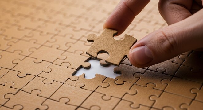 Hand placing the final puzzle piece to complete the jigsaw puzzle