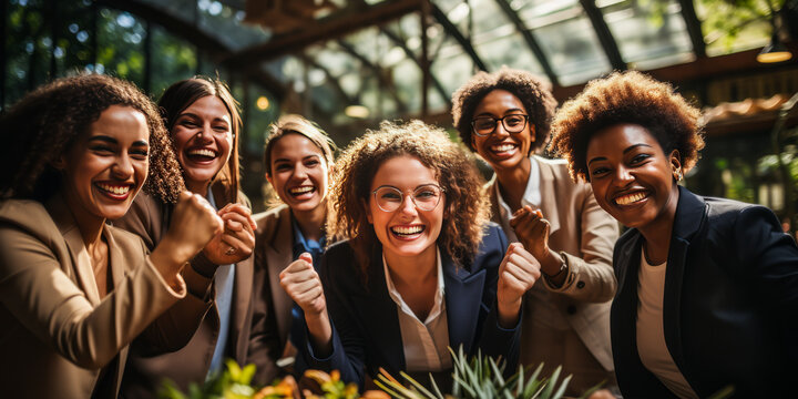 Empowering picture of diverse women in vibrant uniforms celebrating project completion with high-fives in a modern office, embodying teamwork and success.