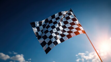 Successful businesswoman celebrating victory, holding checkered flag. Business achievement, goal completion, leadership, motivation. Winning concept, finish line, triumph, success story vector.