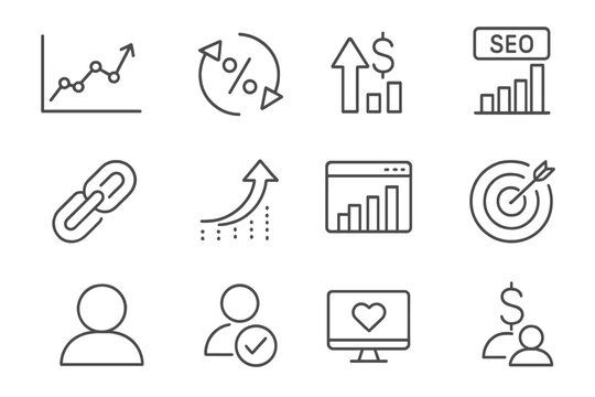 SEO KPI Icons. Line style icons of SEO KPIs: organic traffic chart, conversion rate icon, revenue from SEO, keyword rankings,