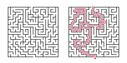 Vector Square Maze - Labyrinth with Included Solution in Balck & Red. Funny & Educational Mind Game for Coordination, Problems Solving, Decision Making Skills Test.