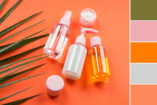 Generic beauty products on orange coral background. Color swatch
