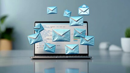 Laptop with multiple email icons floating above the screen, symbolizing communication and digital correspondence.