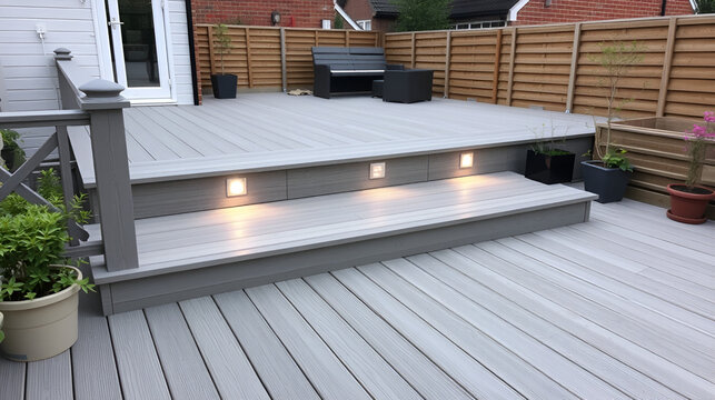 Ash grey composite decking: two-tiered design with deck lights - perfect for landscape gardening projects