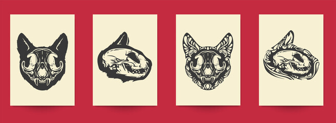 Set of hand drawn art composition with animal skulls in monochrome vintage style isolated on white background. Collection templates for poster, tattoo. Modern design elements. Vector illustration.