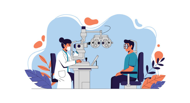 Eye Exam: A close-up of a patient undergoing a comprehensive eye exam, meticulously captured using specialized optical equipment. The scene is set in a clinical environment.