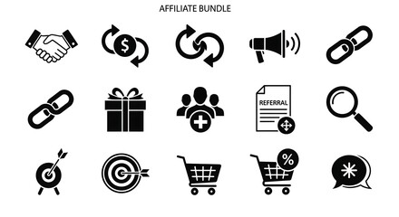 Comprehensive icon set for affiliate marketing, digital commerce strategies, and online business promotion