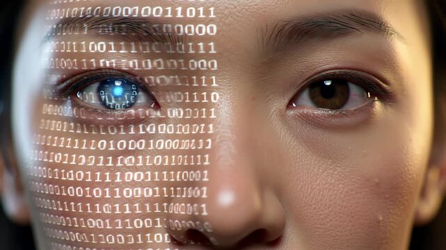 AI face closeup with binary code, dual lighting, subtle code animation, lifelike cybernetic portrait