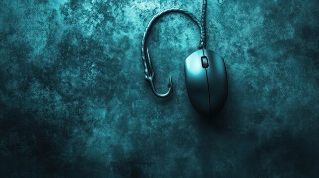 Computer mouse hooked by fishing hook.