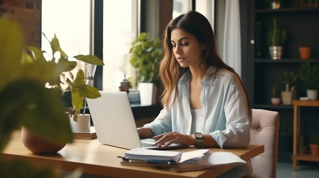 Woman using laptop for learning using artificial intelligence AI, educational tools, video teaching, digital courses, internet lessons, e-learning education concept.