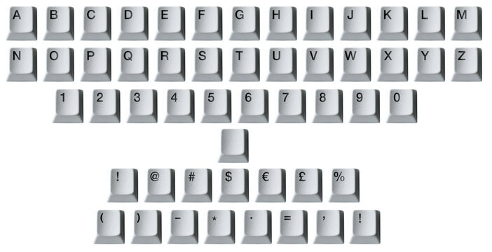 White Computer Keyboard keys Mega pack of letters, numbers and special characters from the alphabet. Premium pen tool cutout. Transparent background PNG.