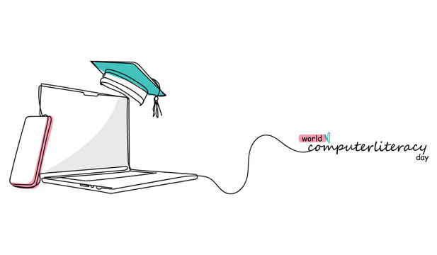 World computer literacy day is celebrated on 2nd December. Digital literacy. Computer related technical efficiency. Foundational computer literacy skills. Advanced programming. Continuous line art.