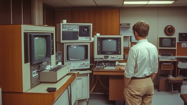 A vintage video lab with an engineer working on the mainframe computer in white and yellow colors, shot from behind him at a right angle to the camera