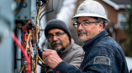 HVAC professionals providing maintenance tips to homeowners, their advice captured in crisp detail,