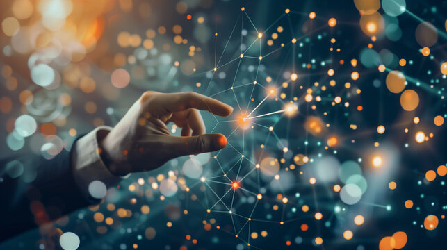 Abstract digital network visualization. Branching lines connect glowing nodes within a tech environment. Orange light beams through blue circuits, suggesting data flow and innovation.