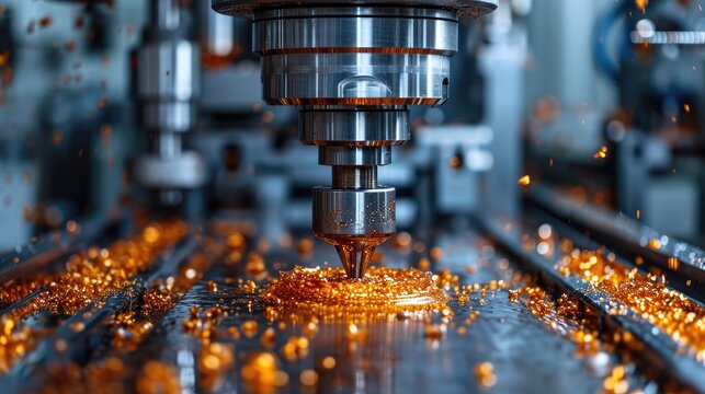 Metalworking CNC milling machine. Cutting metal modern processing technology. Small depth of field. Hi-technology machining concept.