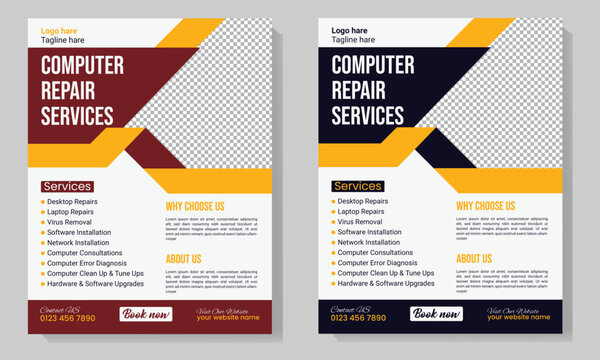 Broken computer front view on flat colored background. Exploding laptop screen, creative banner concept for tech repair shop, computer wizard.