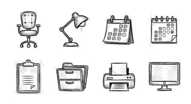 Hand-drawn office essentials: iconic sketch style desk items for workspaces