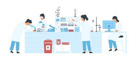 Group of scientists wearing white coats conducting experiments in science laboratory. Male and female researchers in chemical lab. Scientific research. Flat cartoon colorful vector illustration.