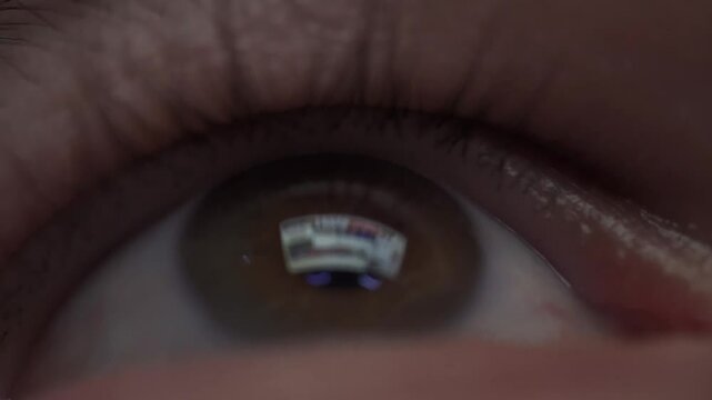 Closeup footage of a human eye reflecting a computer screen, with a visible browsing activity