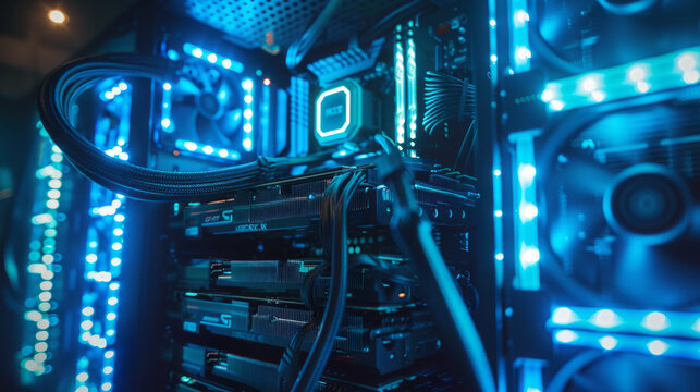 Illuminated interior of a modern computer case showcasing hardware components with neon blue lights and cables connecting parts like the motherboard, RAM, and graphics cards.