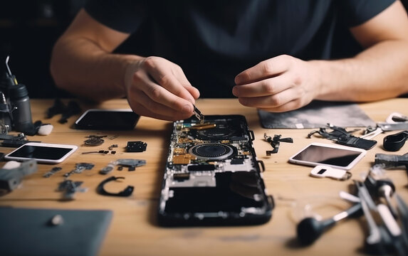 A man repairing a mobile phone on a wooden table