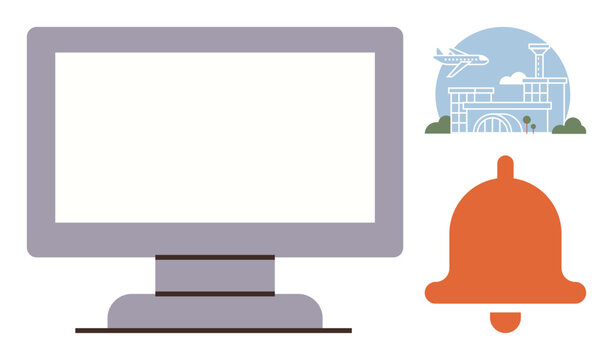 Desktop monitor alongside airport terminal with airplane graphic and alarm bell conveys ideas of travel updates, notifications, digital alerts. Ideal for technology, travel, airport systems