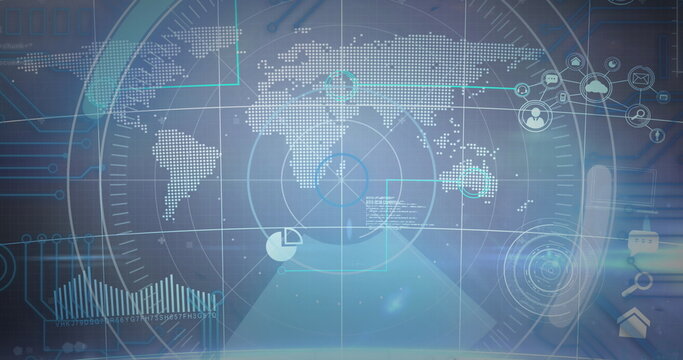 Round scanner over digital icons and world map on blue background