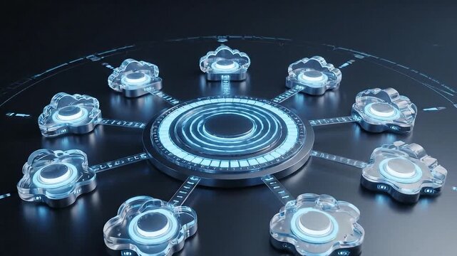 Cloud Computing Network: A conceptual depiction of a cloud computing network, illustrating interconnected devices and data flow. It's a clean, modern design.