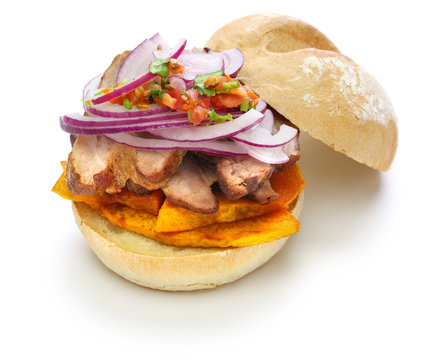 pan con chicharron, peruvian pork sandwich isolated on white background