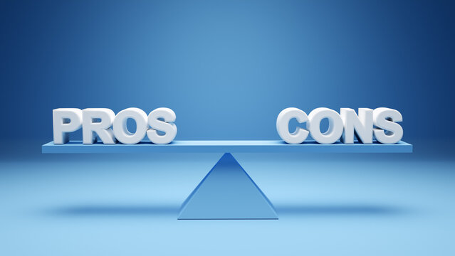 The words pros and cons balanced on a seesaw. Comparing positive advantages or negative disadvantages