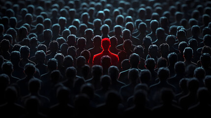 A dense crowd of matte black silhouettes, with a striking red figure in sharp contrast under a spotlight, emphasizing the peril of insider threats in data environments.