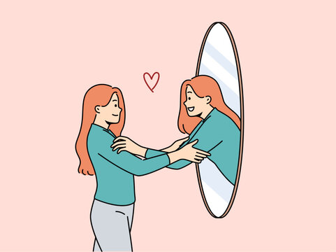 Woman hugs own reflection in mirror demonstrating narcissism and high self-esteem. Girl stands near mirror and rejoices at transformation of appearance after changing image and buying new clothes.