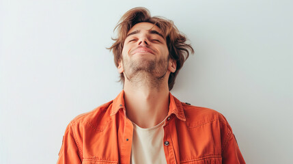 Portrait of serious man with Afro hairstyle wearing orange T-shirt pointing himself, looking at camera with smile, superior privileged status. Indoor studio shot isolated on blue background.