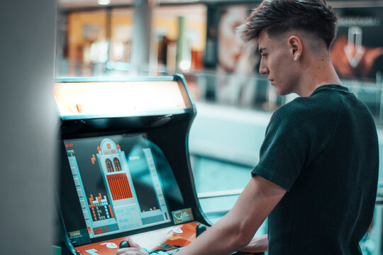 Chico joven jugando con la maquina de videojuegos con gran iluminación