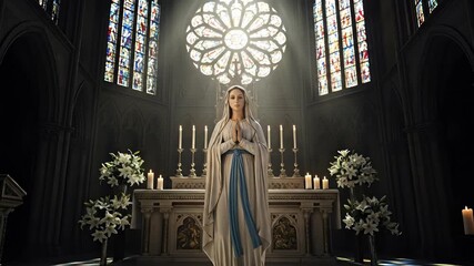 Virgin Mary statue stands at church altar. Divine radiance bathes her. Christian worship, Immaculate Conception feast, December eighth. Spiritual reverence, stained glass windows gleam.