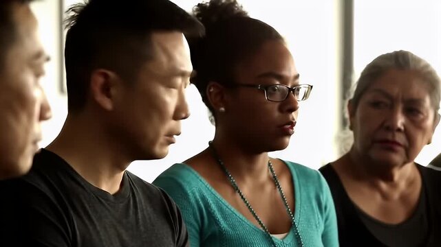 Group of diverse individuals engaged in a serious discussion in a brightly lit room