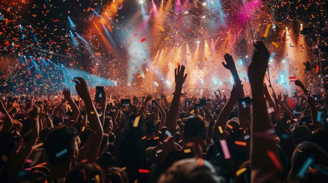 A large group of people gathered at a concert venue, raising their hands and cheering enthusiastically as confetti falls from above.