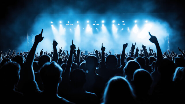 Silhouettes of concert audience with raised hands in music festival setting with bright stage lights and smoke