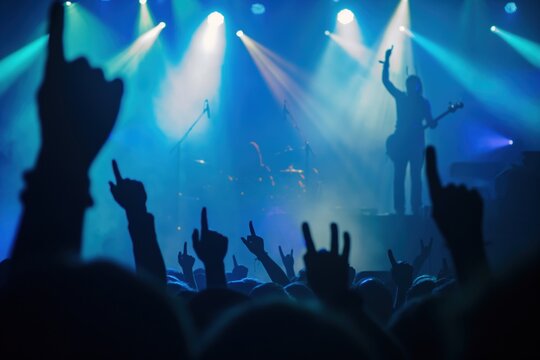 Scena di un concerto di una band di musica rock, folla sotto palco con le braccia alzate