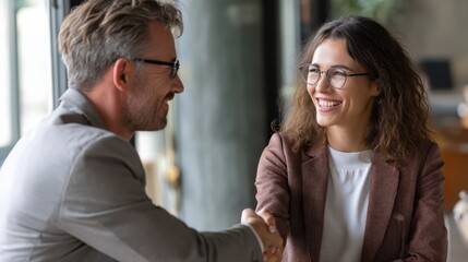 A handshake between a client and consultant at the conclusion of a successful meeting, smiles and gratitude shared.