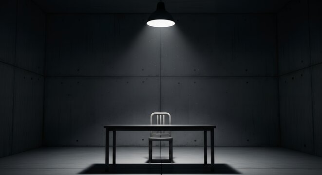 Solitary table and chair under a harsh spotlight in a dark, empty concrete interrogation room.