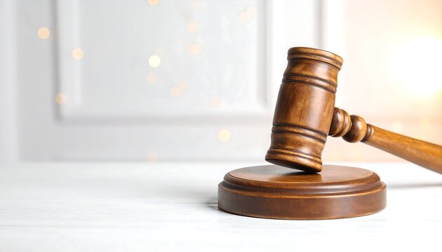 A wooden judge's gavel rests on a polished table.