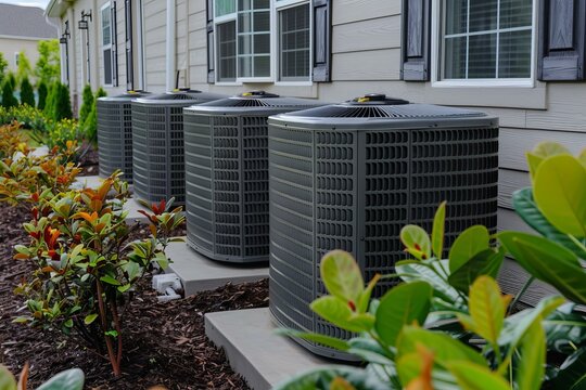 Multiple condenser units, providing climate control for a residential building, are installed on concrete slabs
