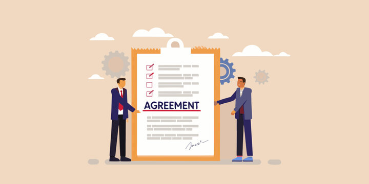 Two businessmen standing next to a large document with the word agreement and checkmarks symbolizing a successful contract or deal