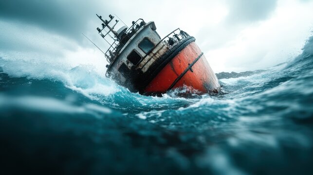 A distressed tugboat navigating through turbulent waves, showcasing the struggles against nature's fury amidst dramatic weather conditions and an icy atmosphere.