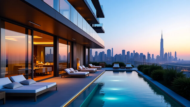 Luxury condominium terrace with infinity pool and elegant lounge, offering breathtaking panoramic views of a vibrant urban skyline at sunset