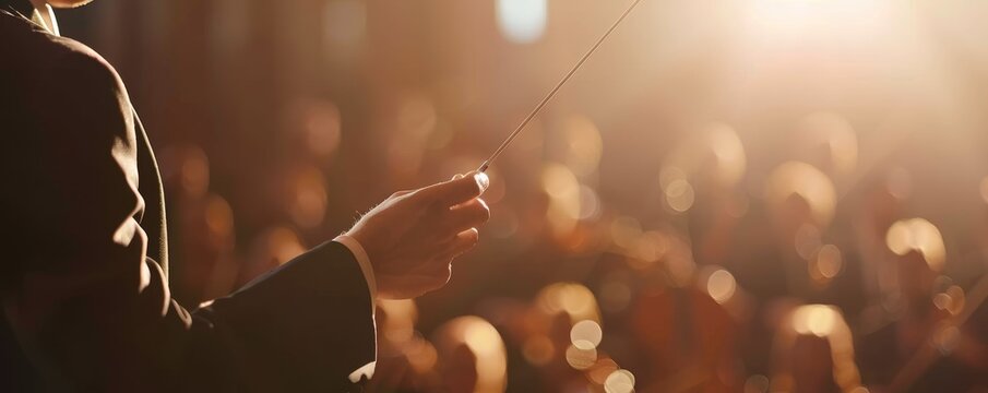 Rear view of a conductor directing a symphony orchestra during a live performance