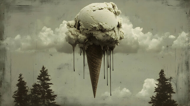 A melting ice cream cone shaped cloud hangs in a vintage sky.