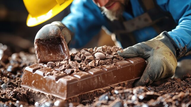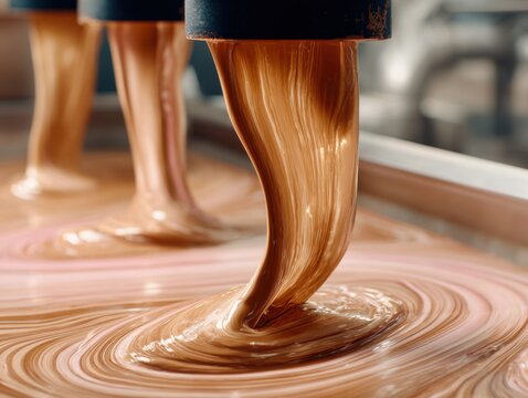 Premium liquid chocolate flowing in confectionery workshop modern artisan food production with precision, creativity, authentic technique for marketing content